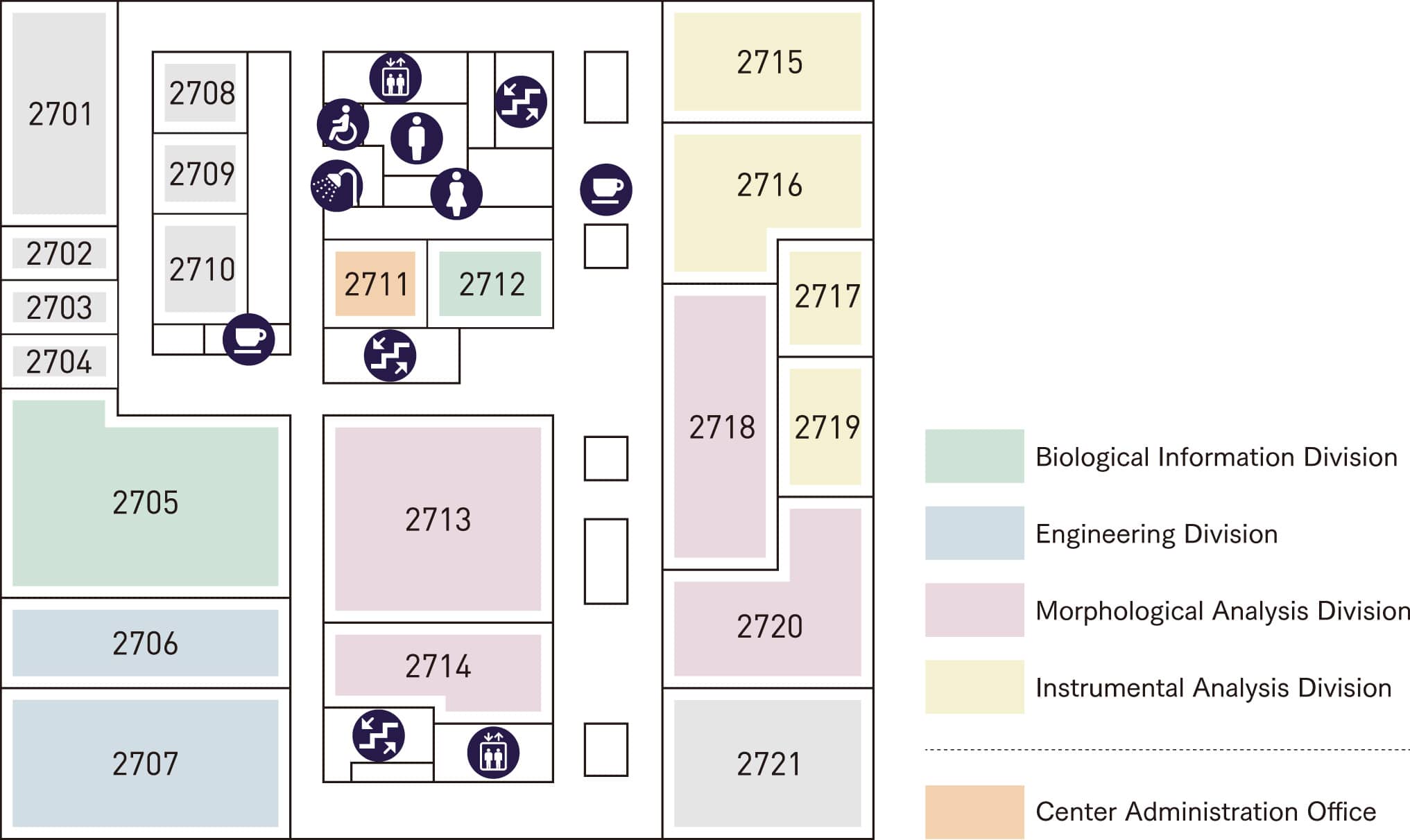 The center is equipped with a wide range of analytical instruments across four divisions—Biological Information, Engineering, Morphological Analysis, and Instrumental Analysis—enabling research on a broad spectrum of targets.