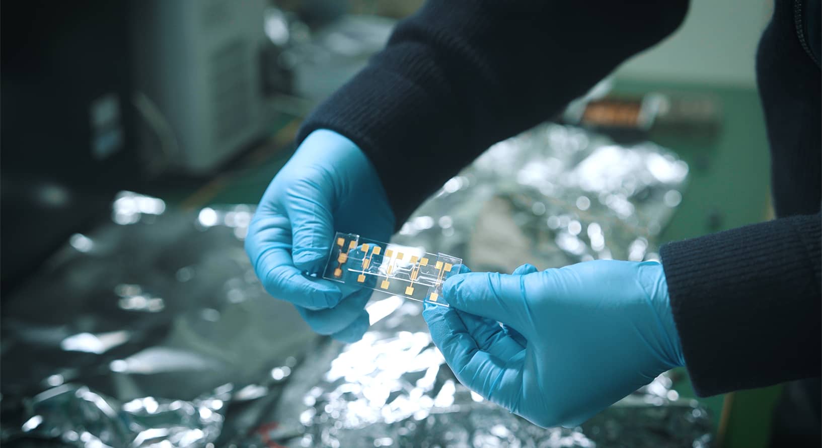 そこで構想されているのが、材料の探索と評価を同時に行う研究プラットフォームです。微小なマイクロチップ上で化学薬品を自動的に送液し、さまざまな化学反応を選択的に起こすことで、材料の合成と評価を一体的に進めることが可能になります。さらに、ナノ構造を付与したチップによって、化学反応の過程をその場で観測しながら材料の特性を評価することもできます。材料探索から合成、評価までのプロセスを、手のひらサイズのチップの中で完結させるという発想です。