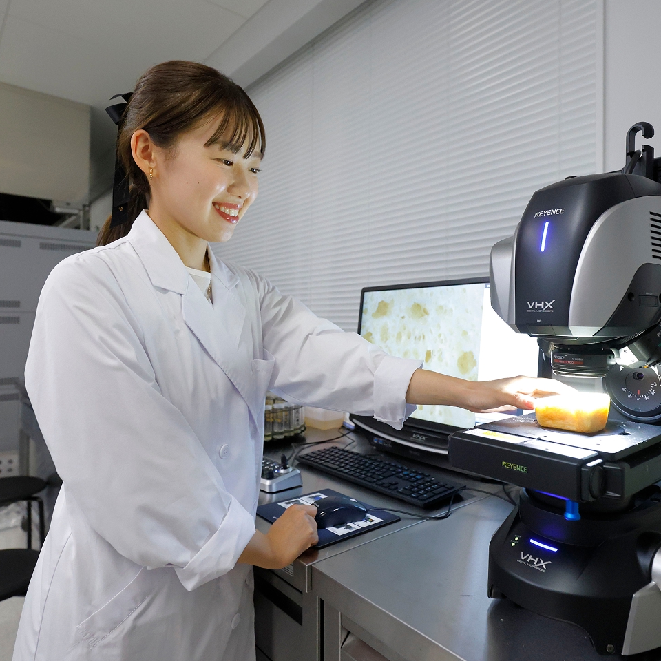 しかし、研究室に所属し先生との距離が近づいたことで、気になったことをどんどん質問できる環境になりました。先生は私の思った疑問を解決する手段を一緒に考えてくださり、できることの幅が一気に広がりました。例えば、「食パンのもちもち感をパンの成分に着目することで数値化できないだろうか」など、自分が「知りたい」と思ったことを確かめる方法を考えるプロセスはわくわくして、実験でデータを集めて考察する研究活動はものすごく奥が深いことだと気づきました。主体的に取り組めば研究はこんなに面白いのに、受け身の姿勢でいた私はなんてもったいないことをしていたのだろう。「私はもっと研究がしたい!」そう後悔する気持ちから、就職活動を中断し、大学院への進学を決意しました。