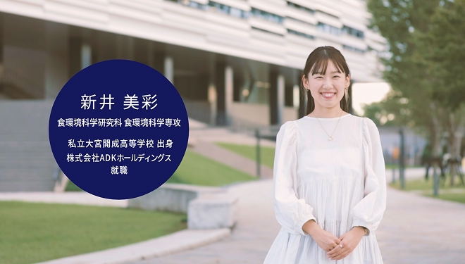 学部在学中は大学祭実行委員などの課外活動に力を入れていたが、4年次に調理学研究室に所属し、研究の面白さに目覚める。大学院進学後は自分の知りたいことを主体的に追究し、漁業の現場を訪ねて知見を深めた。2024年にリニューアルされた朝霞キャンパスの学生食堂「Umart!」にて運営チームのリーダーを務め、産学連携でのメニュー考案や食材選定にも取り組んだ。広告業界で働き、いつか「食」の魅力を発信する仕事をするのが夢だという。