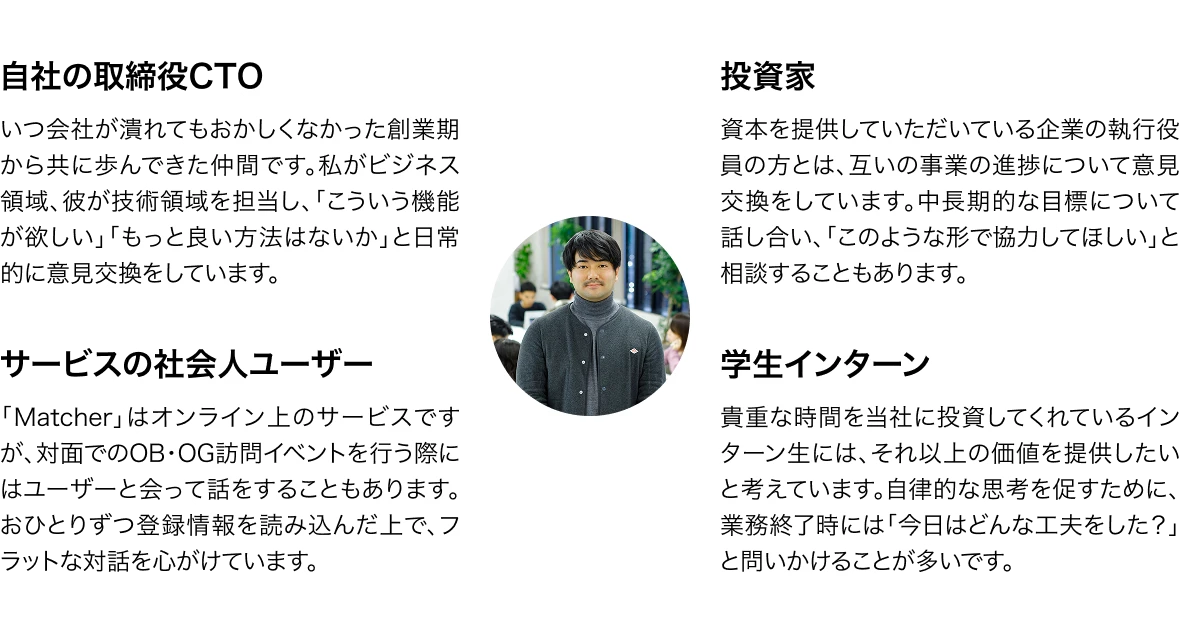 70個ほどの事業のアイデアをノートに書き出し、「自分でなくてはいけない」かつ「今でなくてはいけない」ことに絞り込んでいく中で、ヒントになったのは学生時代の経験でした。私自身、毎回満員御礼となる学生50人と社会人50人を集めた合同OB・OG訪問イベントを企画・開催しており、大学の垣根を超えて社会人の話を聞きたいと考えている大学生は多いという確信があったことが、学生と社会人をマッチングする就活アプリ「Matcher」の着想につながりました。創業当初は資金繰りに苦労しましたが、リリース後1年は収益化を行わず、「先義後利」のサービスを展開。ユーザー満足度を高めたことで、投資家の方々にも事業の成長可能性を理解していただけたように思います。
