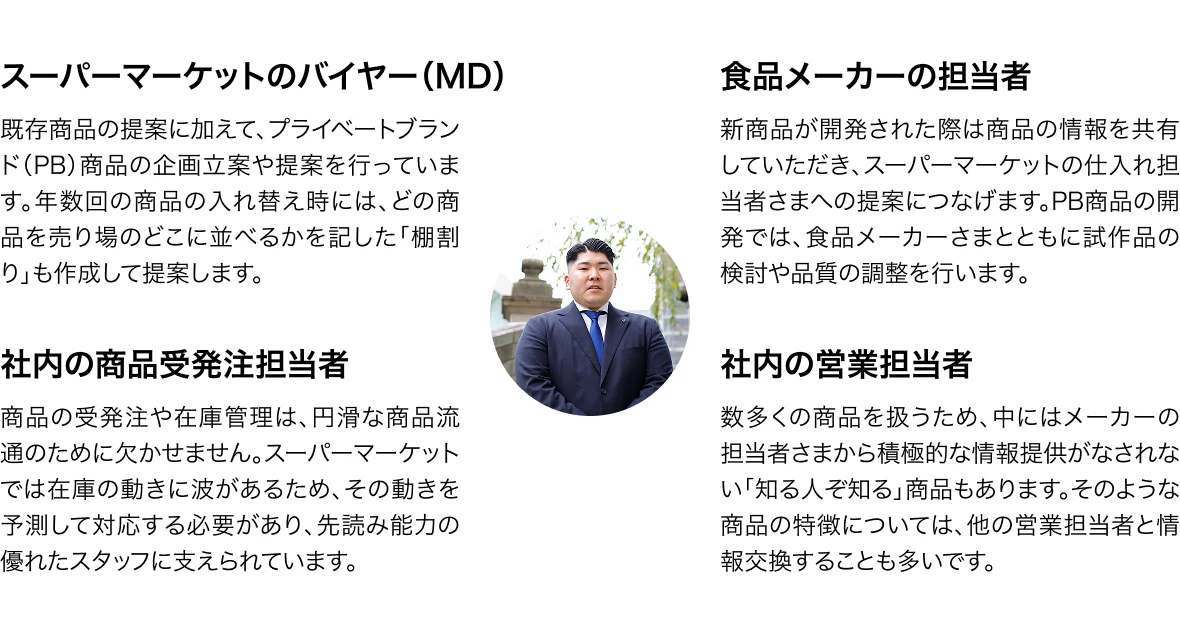 私は入社2年目から営業担当になったのですが、当時は何が分からないのかも分からない状態でした。「一生懸命であること」が自分のとりえなので、先輩社員から情報収集をしたり、新商品は積極的に試食したりして、まずは商品知識を身につけることから始めました。そして、お取引先さまをお待たせすることがないように、メールはすぐに返信するといった早めのレスポンスも心がけました。現在のお取引先さまの中には、月間で5000万円を超えるお取引をさせていただいている店舗もありますが、それだけの金額と品数を動かす仕事だからこそ、日々のやり取りの中で信頼関係を築いていくことが重要になります。営業として求められる知識はもちろん必要ですが、人として信頼してもらえるだけの人間力を高めていく必要がある仕事だと実感する日々です。
