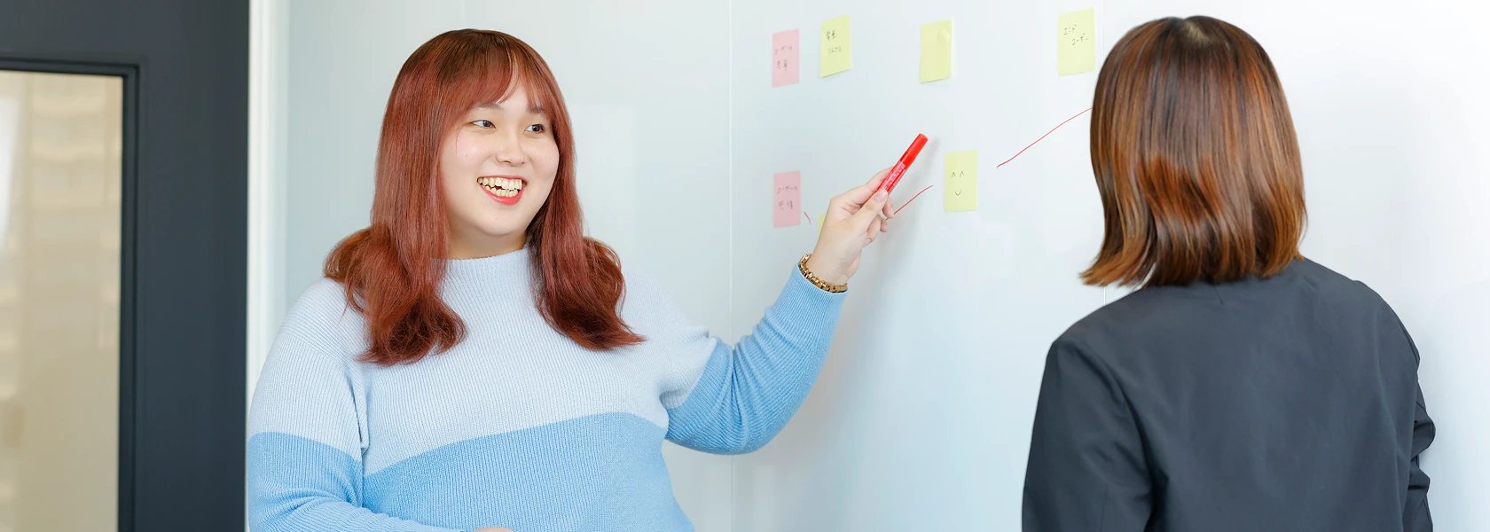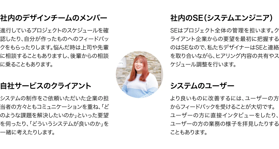 グラフィックデザインの基礎や色彩の理論など、大学時代には「点」として学んでいた知識が、仕事をする中で「線」となり、デザインへの理解が深まっていくのを日々感じています。現在は社内においてデザインに関する研修の講師も務めており、社内でデザインの価値をもっと高めていきたいと考えています。そして、社内でデザインに関して悩むことがあれば真っ先に相談してもらえるような人になり、当社のシステムが「デザインが良くて世界一使いやすい」と言われるような未来の実現に貢献していきたいです。