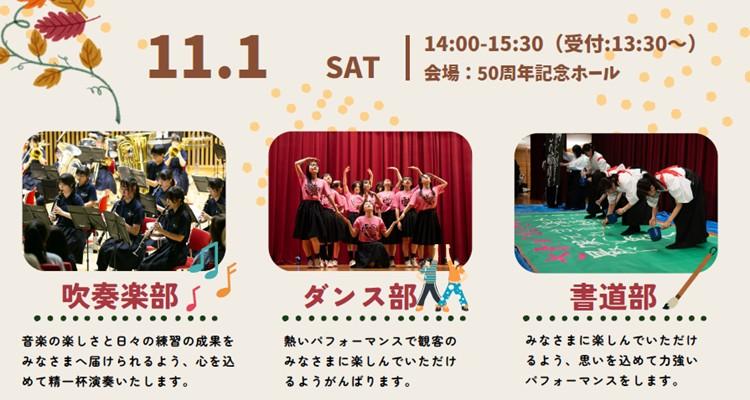 【中高共通】本校記念ホールで吹奏楽部、ダンス部、書道部のパフォーマンスをご覧いただけます。