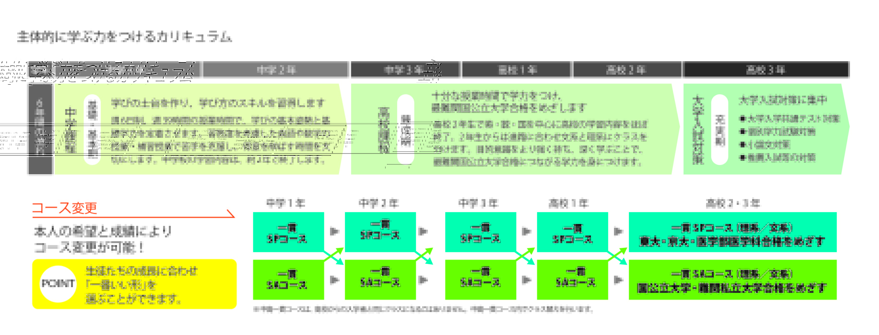 入学時は学力到達度に応じて「SPコース」または「SAコース」に所属していただきますが、これは6年間のゴールを決定するものではありません。