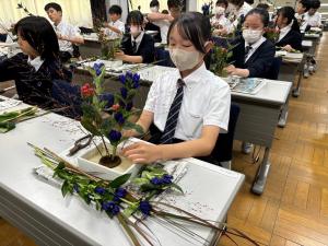 中学2年生の総合学習の時間に佐野先生をお招きし、華道教室を実施しました。今回は主材としてパニカム、副材としてりんどう、ヒペリカムを用いて生け花体験をしました。生徒たちは少し慣れてきた様子で、程よい緊張感の中、楽しみながら取り組むことが出来ました。