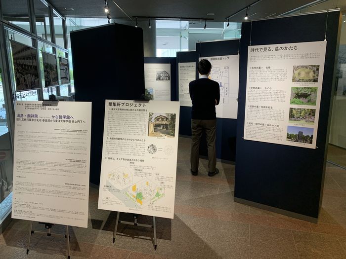 文学部の博物館学芸員養成課程「博物館実習Ⅱ」、公認サークルの日本史学研究会、理工学部地域デザイン研究室に所属する学生が共同し、本学誕生の地である麟祥院(東京都文京区湯島)の調査とともに、歴史や本学との関係について学生独自の研究成果を14枚のパネルにまとめ、白山キャンパスの井上円了記念博物館ロビー展示エリアで展示しました。展示期間は2025年11月6日までです。
