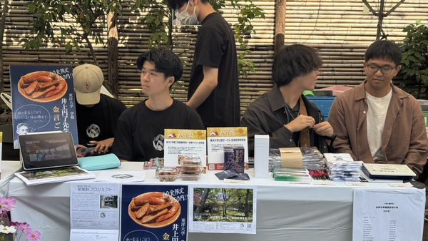 この取組みに関連し、2025年10月18日、麟祥院で開かれた『春日忌』において、本学公認サークル日本史学研究会と理工学部地域デザイン研究室の合同で<東洋大学ブース>を出展しました。「葉集軒プロジェクト」の展示紹介とともに、本学オリジナルグッズのコーヒー「井上円了珈琲物語」などを販売し、多くの方に注目していただきました。