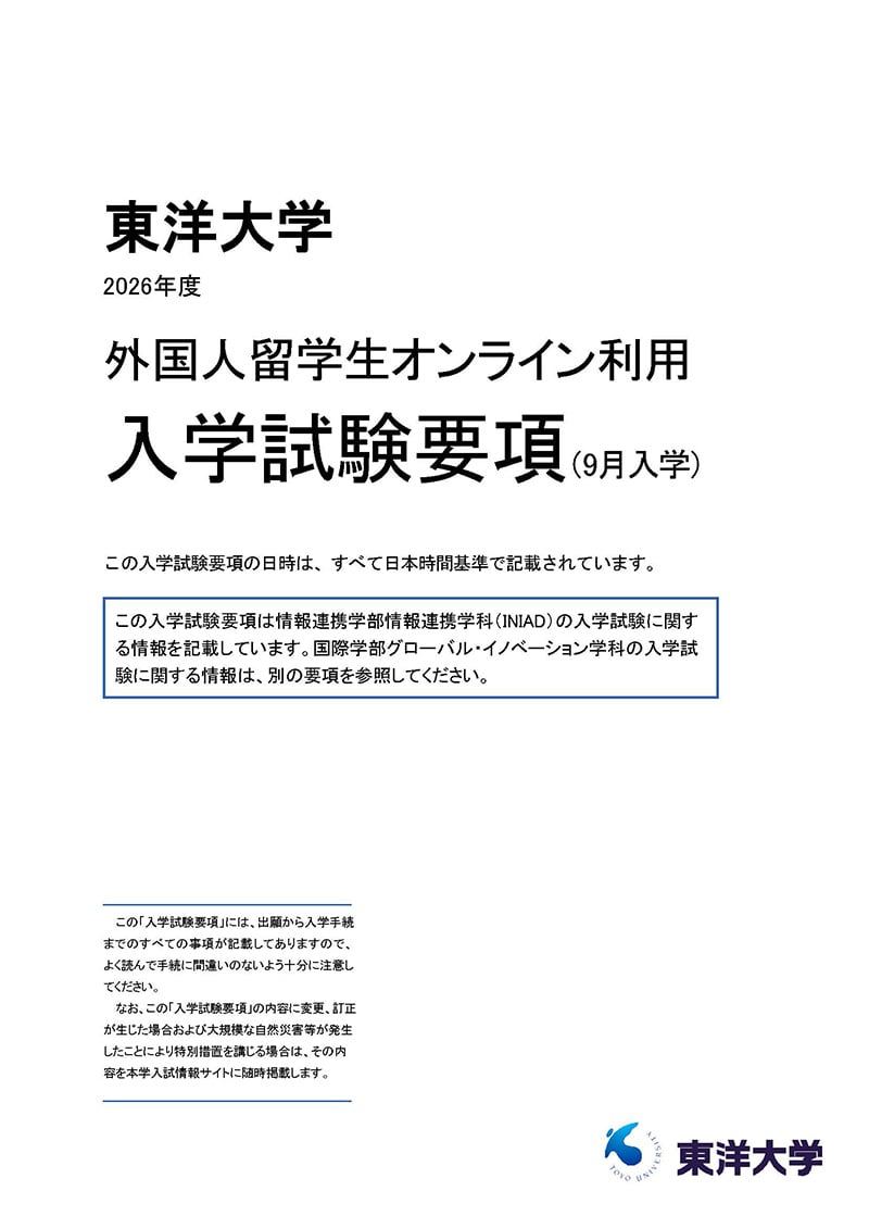 - Online Entrance Examination Offered to International Applicants for the Department of Information Networking for Innovation and Design (Japanese track) (for Admission in September 2026) (外国人留学生 オンライン利用 入学試験要項)2026年9月入学 情報連携学部