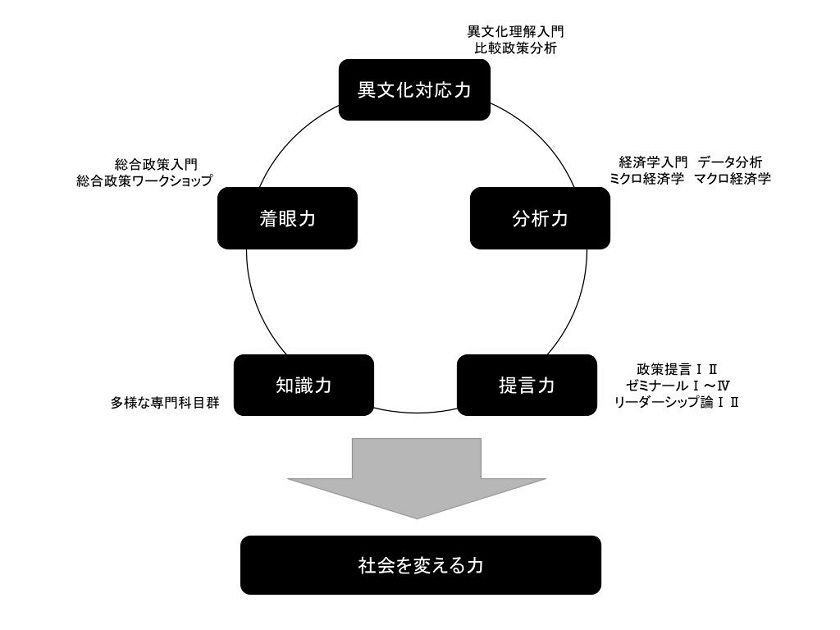 複雑で変化の速い現実社会は、多様な問題を抱えています。総合政策学は、経済学・政治学・法学など単一の学問分野では十分に扱えない政策課題を対象とし、複数分野の知見を統合することで、実行可能な政策的解決策を検討・提示することを目的とします。
